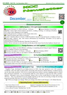 Announcement Call for Speakers: 15th English Speech Contest(2/14) Foreign Residents, Let's Talk Together!(12/4) Online International Exchange Salon Do You Know About LGBTQ?(12/18) Online International Exchange Salon Laughter Yoga ― Refresh Your Mind and Body with Laughter <Upcoming Events> (January 2026 onwards) Kashiwa/Kashiwanoha Japanese Language Class Field Trip (10/12) Japan-U.S. Leadership Summit (10/10) Halloween Party with Foreign Residents (10/25) Kashiwa International Exchange Festa 2025 (10/19) December Events |