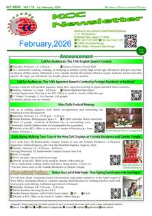 Announcement ・Call for Speakers: 15th English Speech Contest(2/14) ・Call for Audiences: The 10th Japanese Speech Contest by Foreign Residents in Kashiwa”(2/15) ・Hina Dolls Festival Meetup(2/21) ・Early Spring Walking Tour: Tour of the Hina Doll Displays at Yoshida Residence and Daitoin Temple(2/22) ・Online International Exchange Salon Let’s Connect with the World of Sign Language(2/19) ・Cross-cultural Teatime “Burkina Faso: Landof Noble People - Those FightingDesertificationin the SahelRegion”(2/28) ・Online International Exchange Salon Easy Japanese: Enjoy Communication with Questioning Skills (11/20/2025) Do You Know About LGBTQ? (12/18/2025) ・Youth Sumo Tour (11/22/2025) ・Year Online Exchange with Students in Torrance City (1/4) Hello!Friends Full Circle Moments(Back to Kashiwa for the Second Time) Ms.Yuko Wilson, Assistant Language Teacher (ALT), Kashiwa Municipal Kashiwa High School February Events |